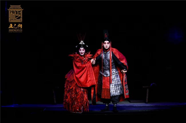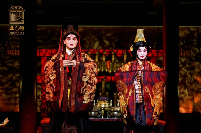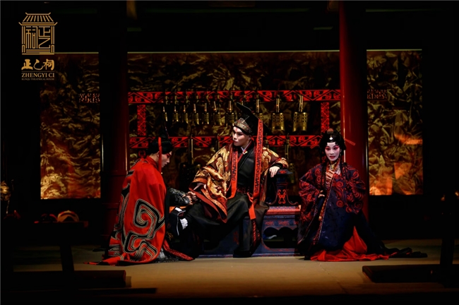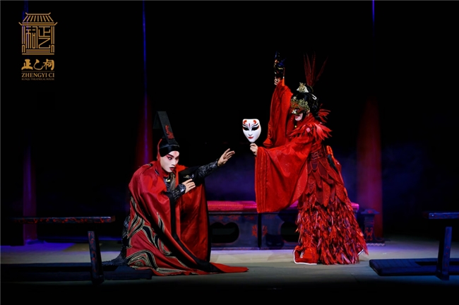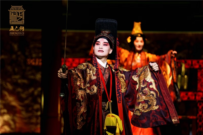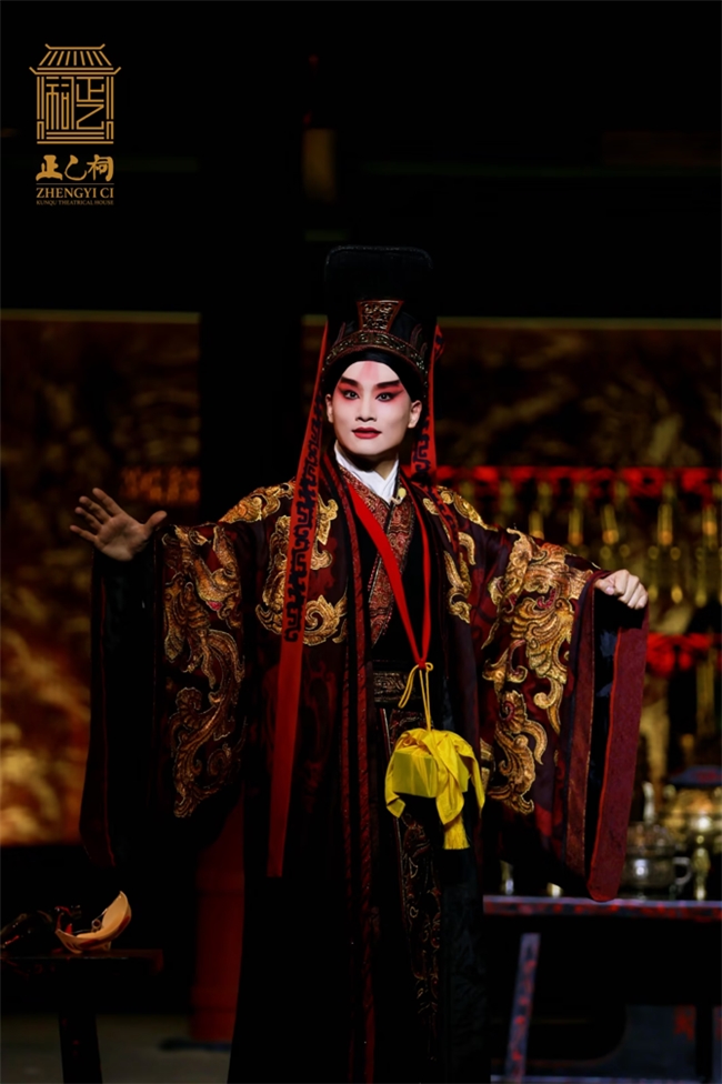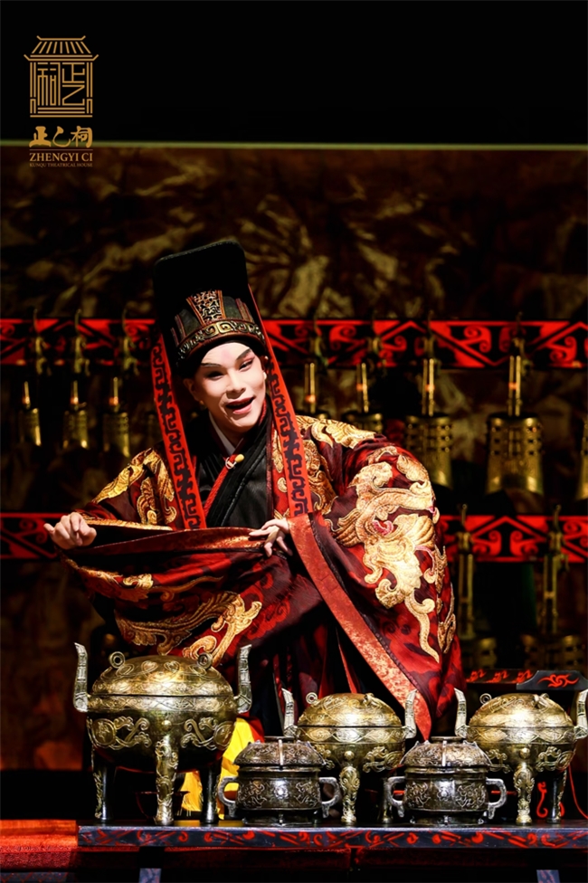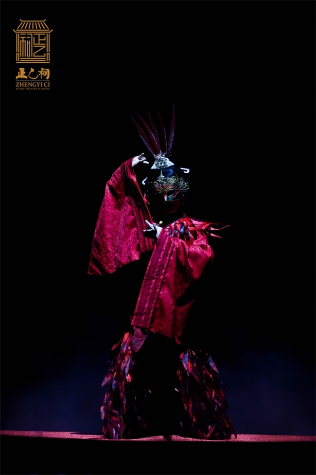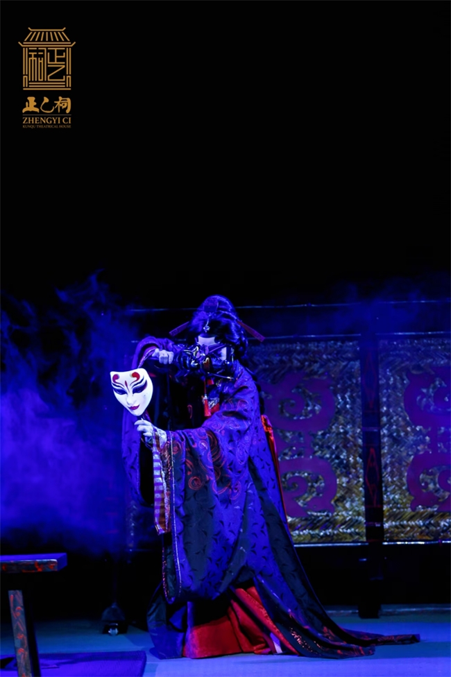 此次演出的艺术呈现尽显匠心。服装设计于淼与造型设计张丽萱打造的服饰与造型,萃取楚漆器、织绣纹样与巫傩面具元素,在古典形制中透出神秘威严;唱腔作曲张贝勒作为该剧的作曲兼主演,以婉转南曲摹写心绪缠结,用遒劲北曲铺陈冲突张力,坚守昆曲“字清、腔纯、板正”的艺术精髓;音乐作曲王天赐的创作,则让传统昆曲乐队焕发新声,音乐设计中编钟的点睛运用,更以庄严恢弘的音色奠定楚地仪式基调,在巫傩场景中更显神秘古远。而朱红梁柱、雕花戏台与古色古香观演席相映成趣的正乙祠,本身就是一件“活的文物”,其历史厚重感与巫傩仪式的神秘质感完美交融,构建出“戏在楼中、楼在戏中”的独特意境。